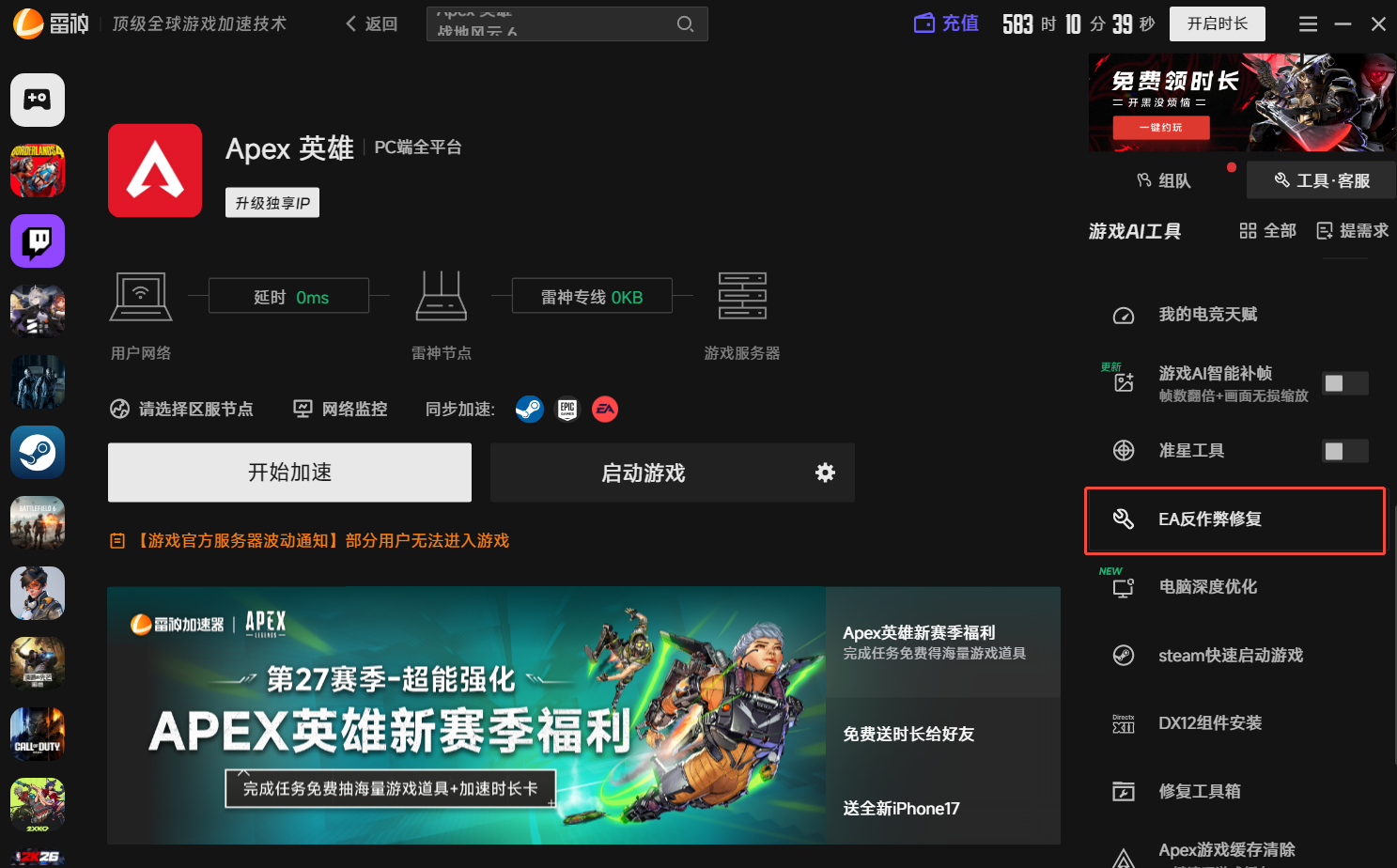 Apex英雄更新后提示反作弊报错、反作弊验证失败等问题,可使用雷神加速器快速解决,针对反作弊报错问题,雷神提供专业修复工具,打开雷神客户端进入Apex英雄加速页,点击右侧工具栏【EA反作弊修复】按钮,可快速解决问题。