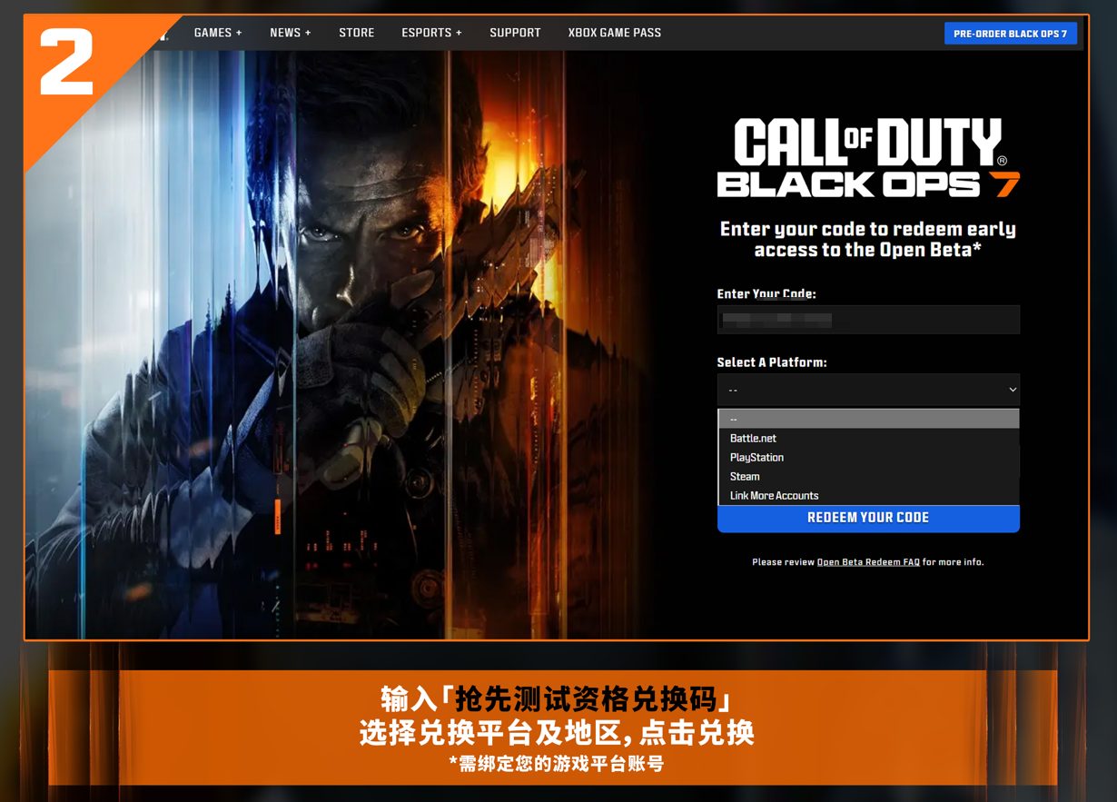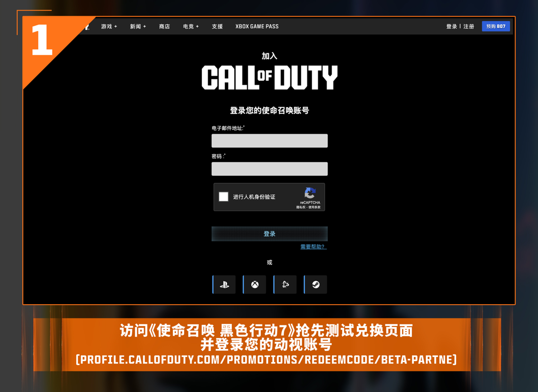 1、点击右侧链接跳转前往使命召唤官网测试资格兑换页面:https://profile.callofduty.com/promotions/redeemCode/beta-partner ,新用户请先注册登录动视账号。如页面打开加载缓慢,可先通过雷神加速《使命召唤》;