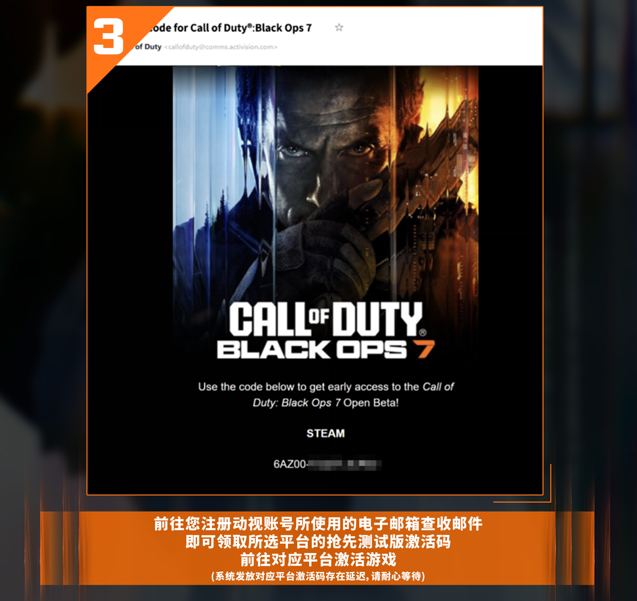 4、前往注册动视账号使用的电子邮箱,找到最新邮件,领取所选平台的抢先体验测试版激活码,前往对应游戏平台激活测试版《使命召唤:黑色行动7》即可。