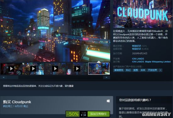《云朋克》折后价为34元,是该作的新史低价,优惠活动截止日期为6月2日。