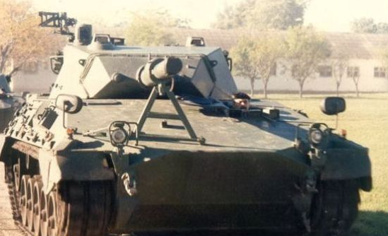它以德国“黄鼠狼”步兵战车底盘为基础,前上装甲明显倾斜。驾驶员在车体前部左侧。车顶水平,炮塔偏车体后部,侧视时,车尾呈楔形。炮塔侧面为斜面,微向内上方倾斜。炮塔尾舱向后延伸几乎与车尾齐平。炮塔顶平,车长指挥塔在右侧。105mm火炮安装在外侧防盾内。