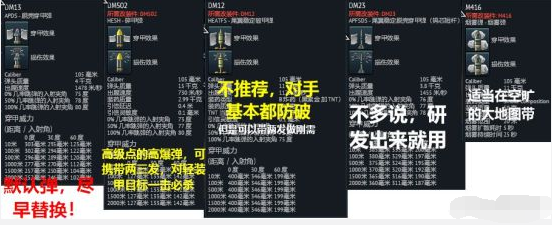 炮弹方面,默认弹是APDS,比较坑,所以我们需要先优先把属于二级配件的HEATFS研发出来。但是由于9.0很有可能遇见9.3甚至10.0的有很强防破能力的对手,所以在研发HEATFS之后在携带的同时APDS也需要带几发。熬过了前面这一段时间之后,就能把全游戏最好的弹种祭出来了——APFSDS。