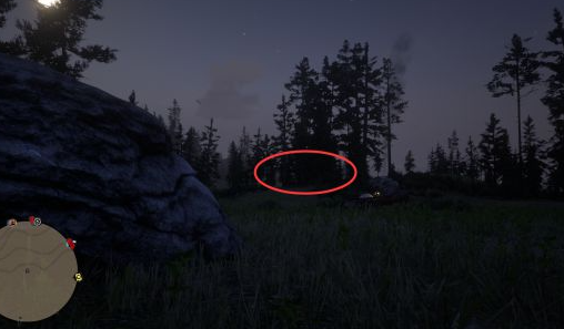 红圈是白尾鹿公鹿的具体位置,一般会有1-3只鹿。看不清的话可以看看有没有鹿,有多少只鹿。如果没有,就在下图左下角的大石头旁边建一个临时营地,然后马上拆除营地。然后打开鹰眼看看有没有刷新。如果没看到什么3星鹿,也可以搭建一个临时营地,然后马上拆营提神。