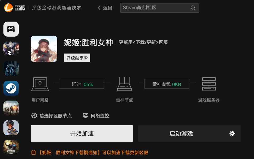 打开雷神加速器,搜索胜利女神:妮姬点击“开始加速”按钮,完成前置网络优化,确保不会因为网络原因影响下载。