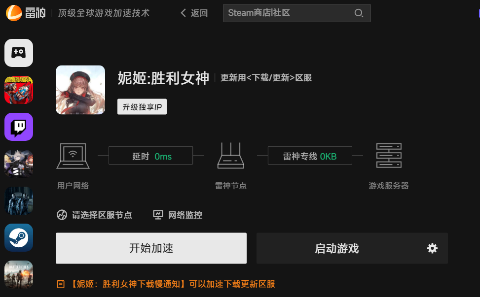 网络连接不稳定可能导致胜利女神:妮姬延迟高、丢包、卡顿、闪退问题,雷神加速器针对胜利女神:妮姬优化了网络路径,有效降低网络延迟,减少丢包、卡顿情况发生,稳定游玩不闪退。