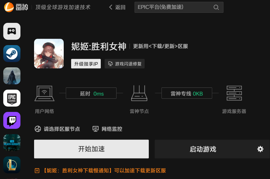 出现加速完成提示后,重新启动进入妮姬胜利女神,即可低延迟流畅体验。