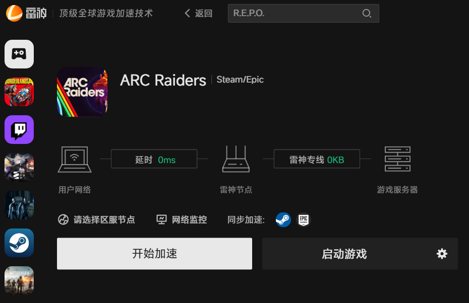 第三步:回到首页,顶部【搜索游戏】栏输入“ARC Raiders”,选择对应区服版本,完成加速优化,畅享丝滑流畅游戏体验。