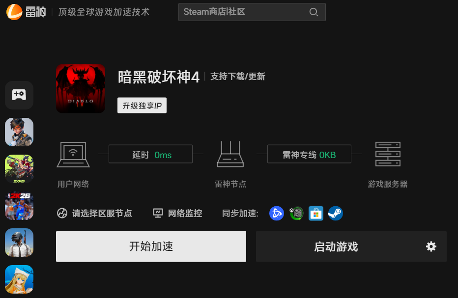 由于暗黑4对于玩家网络有访问限制,所以玩家在开启steam下载、游玩的时候,都需要使用到加速器。建议提前打开雷神加速器,加速对应游戏或者游戏平台,解决网络访问限制问题,保证steam下载游玩暗黑4顺利操作。