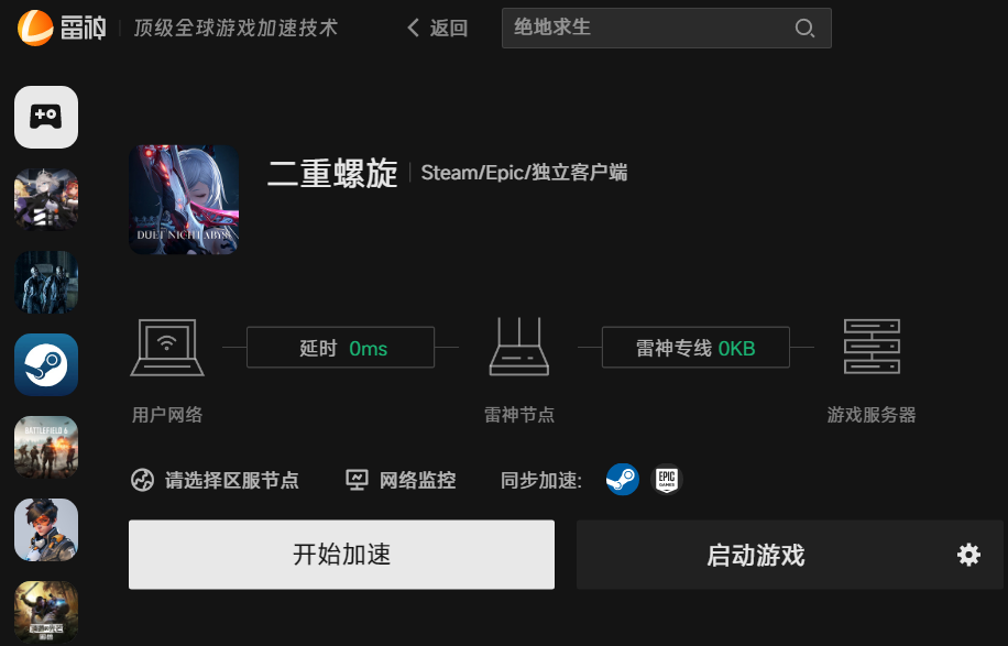 打开雷神加速器,在搜索栏输入“二重螺旋”,选择延迟低于50ms的节点加速,确保网络稳定;