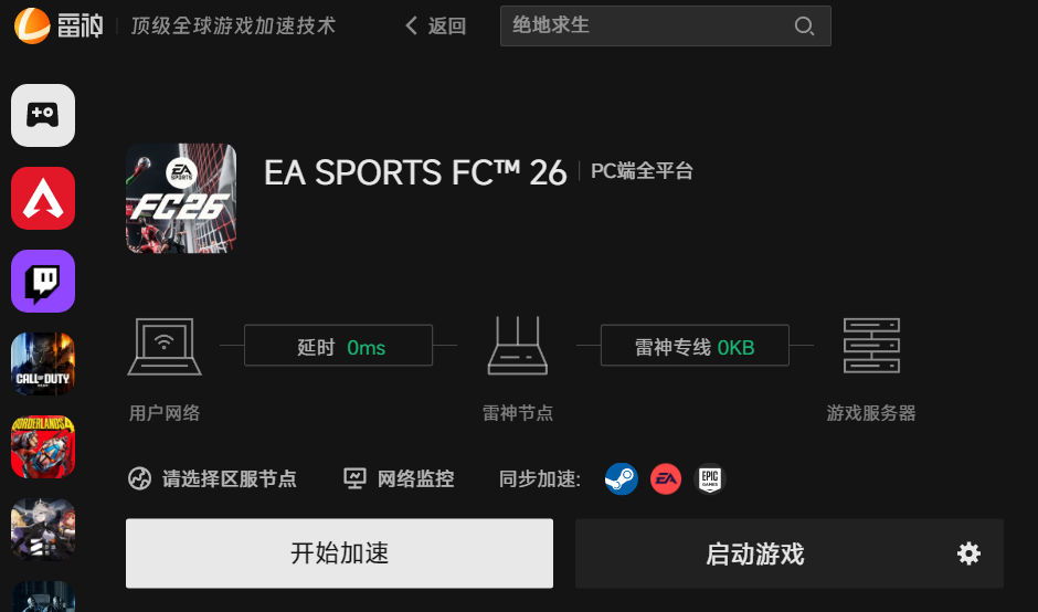 在EASPORTSFC26/FC26游玩过程中,玩家常遇到点击游戏无响应、进入游戏后游玩卡死、操作指令延迟过高、多人竞赛时频繁掉线等网络问题,这些问题多由网络波动、服务器连接不稳定或本地网络与游戏服务器节点匹配不佳导致,严重影响游戏体验。此时可以使用专门的游戏网络优化工具-雷神加速器快速解决。