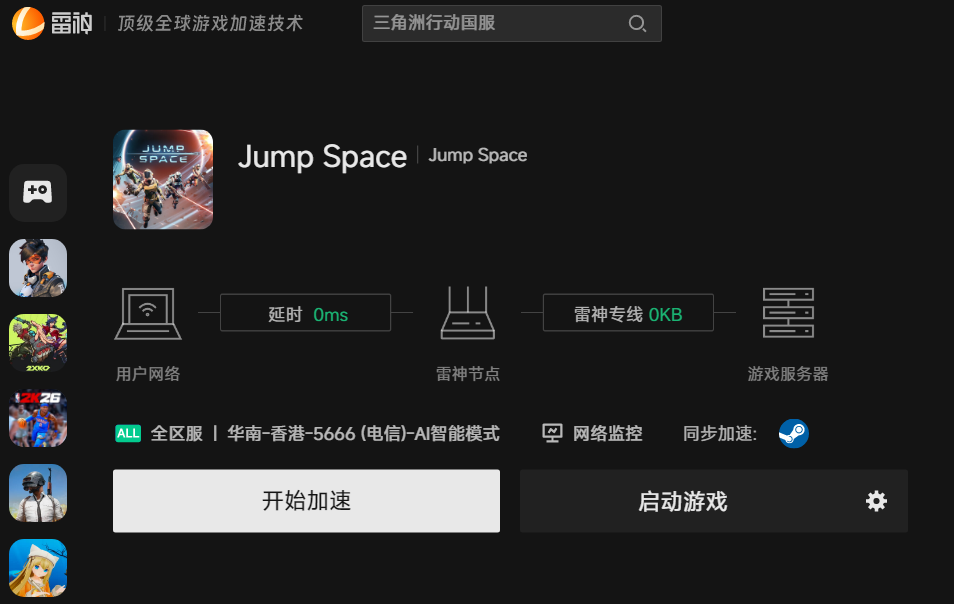 回到首页,顶部搜索输入“Jump Space”,选择对应区服版本,完成加速优化,畅享丝滑流畅游戏体验。