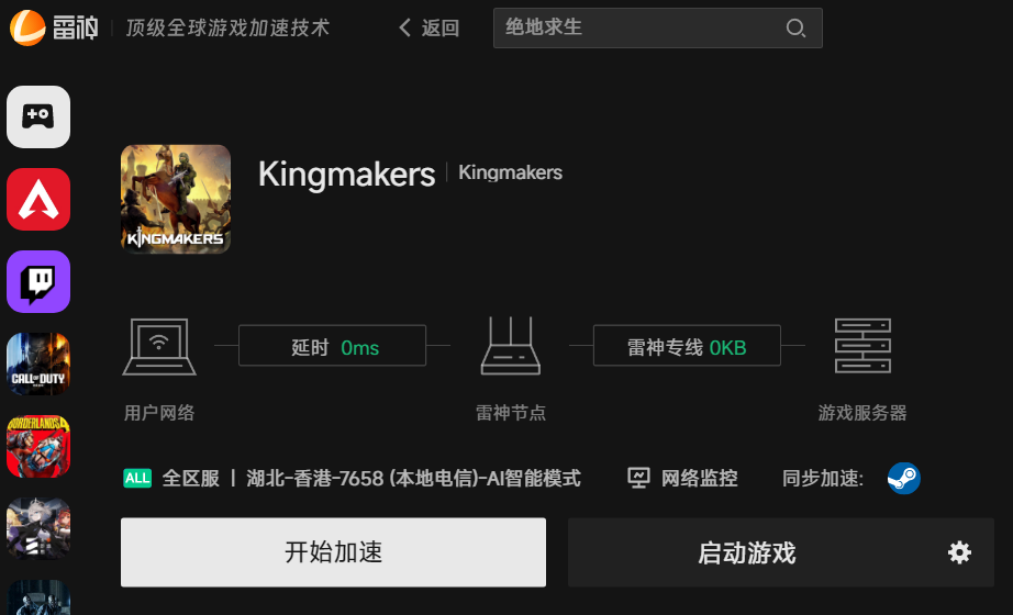 第三步:回到首页,顶部【搜索游戏】栏输入“Kingmakers”,选择对应区服版本,完成加速优化,畅享丝滑流畅游戏体验。