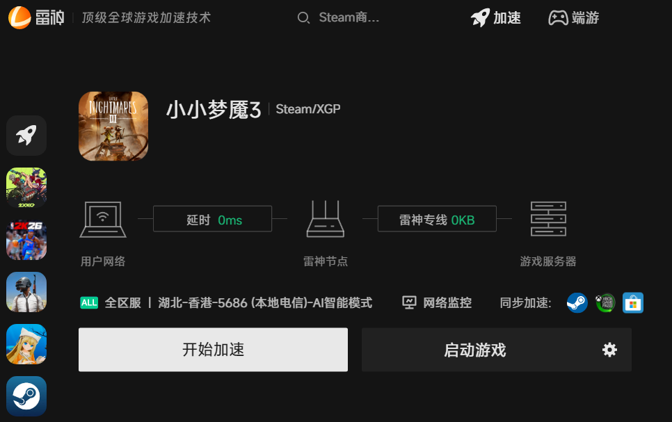 玩小小梦魇3时,尤其是双人联机或PC端高画质运行场景,容易出现网络延迟高、卡顿、等问题,影响游戏体验,这时可使用专门的游戏网络优化工具-雷神加速器快速解决。