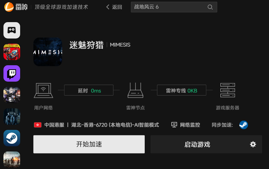 使用雷神加速器是解决迷魅狩猎/MIMESIS此类网络相关游戏问题的最有效方法!它能优化网络、提速、稳连。解决延迟高问题,还能让你后续游戏更流畅。