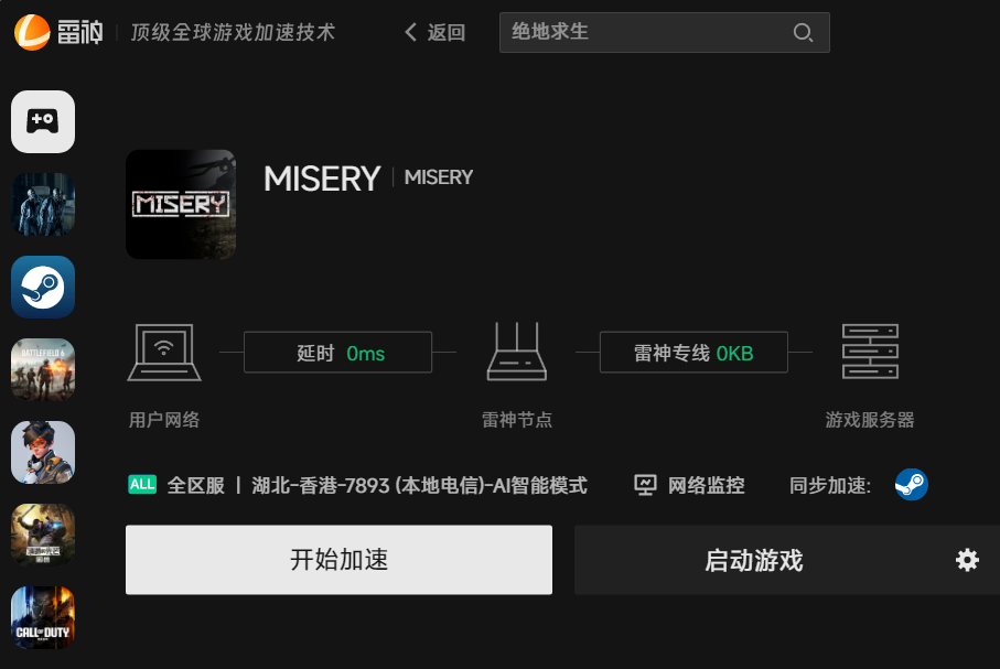 网络原因导致的核处逢生/MISERY黑屏问题,可以使用专门的游戏网络优化工具-雷神加速器,进行快速有效解决。