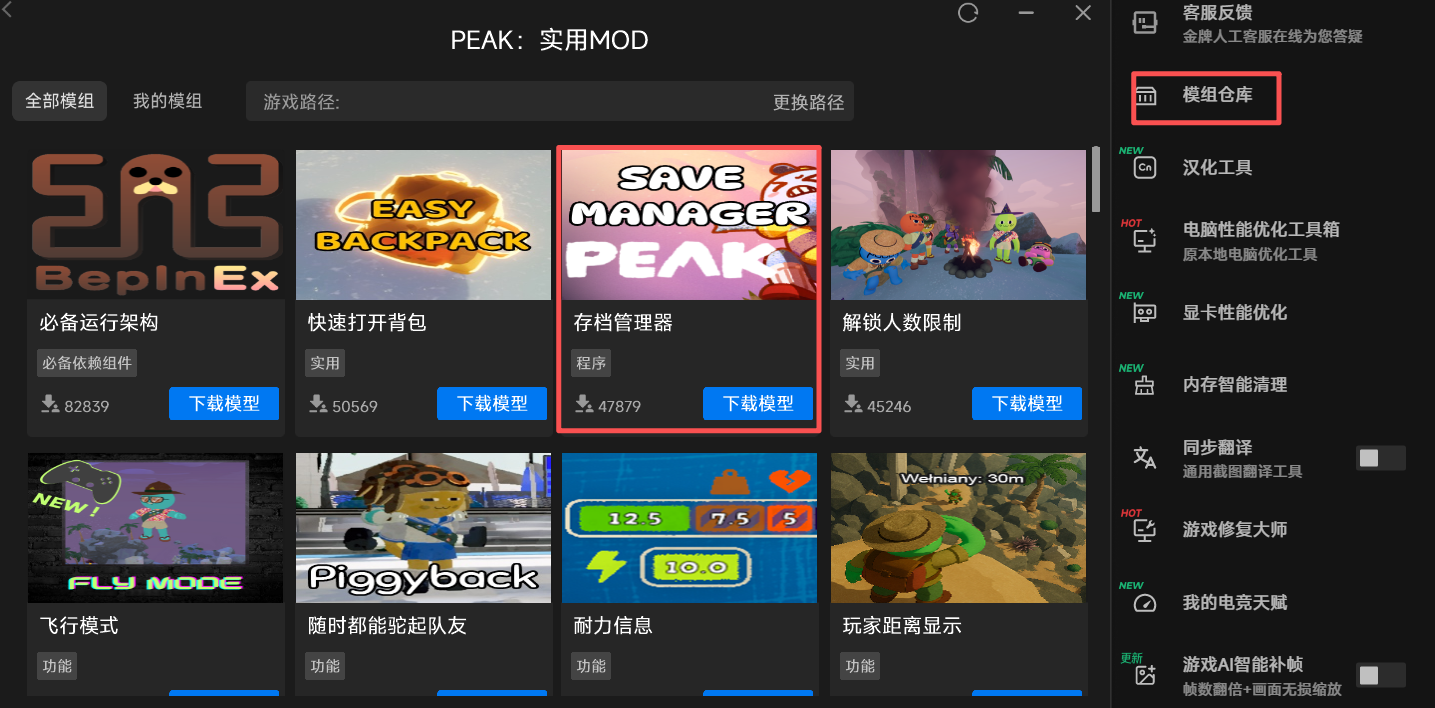 网络原因导致的PEAK更新后存档消失、无法存档,可以使用雷神加速器模组仓库中存档管理器MOD快速解决。除了存档管理器MOD,还有必备运行架构、快速打开背包、解锁人数限制等实用MOD,玩家可根据自己的需求进行下载,点击右侧【模组仓库】即可。