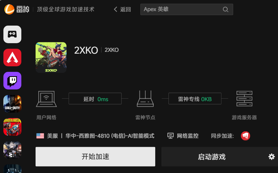 ②打开客户端,在搜索栏输入“2XKO”,根据目标测试服(如美服选北美节点、欧服选欧洲节点)选择匹配的加速节点。