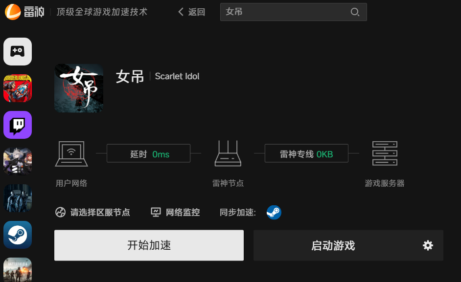 第三步:回到首页,顶部【搜索游戏】栏输入“女吊”,选择对应区服版本,完成加速优化,畅享丝滑流畅游戏体验。