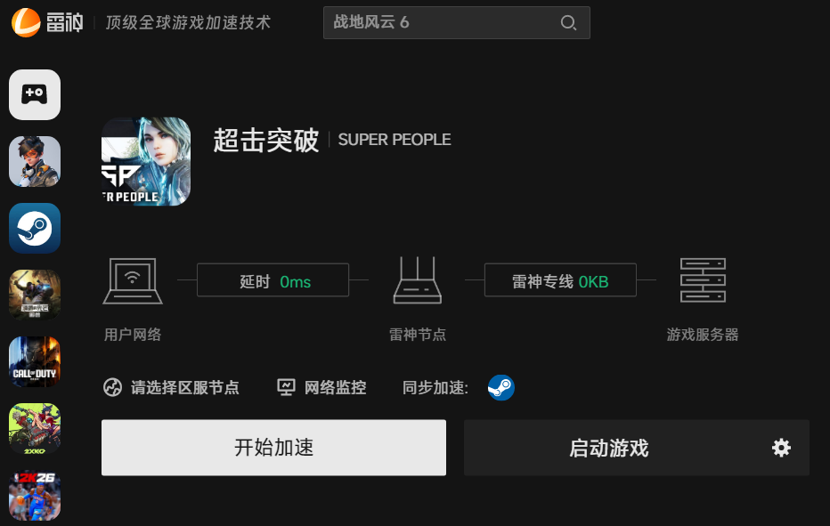 超击突破作为在线英雄大逃杀游戏,玩家常遇到网络问题——比如进入游戏时加载卡顿、组队联机延迟过高(超过100ms)、对抗时技能释放卡顿,甚至出现频繁掉线、服务器连接失败的情况,严重影响战术发挥。想要快速解决这些问题,可以使用专门的游戏网络优化工具-雷神加速器快速解决。