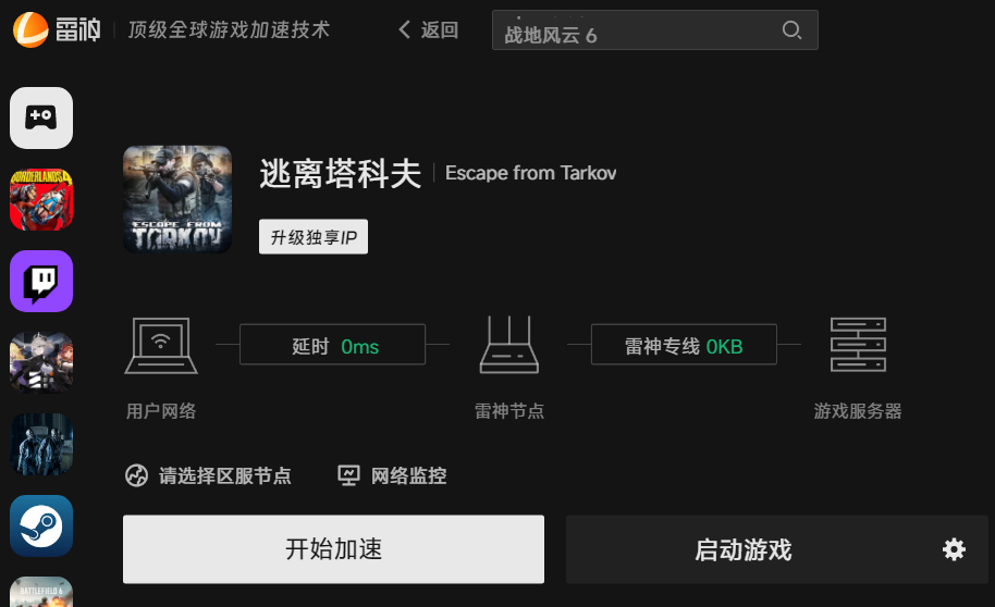 逃离塔科夫1.0Steam端为跨国服务器,游玩时易出现延迟高、卡顿、射击判定延迟、撤离点加载超时甚至掉线等问题,对网络稳定性要求极高,此时可使用专门的游戏网络优化工具-雷神加速器快速解决。