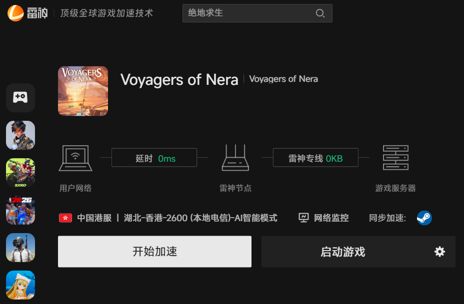 返回雷神加速器首页,在顶部搜索栏输入“Voyagers of Nera”,选择对应区服版本,点击“立即加速”,待显示“加速成功”后启动游戏,即可畅玩。