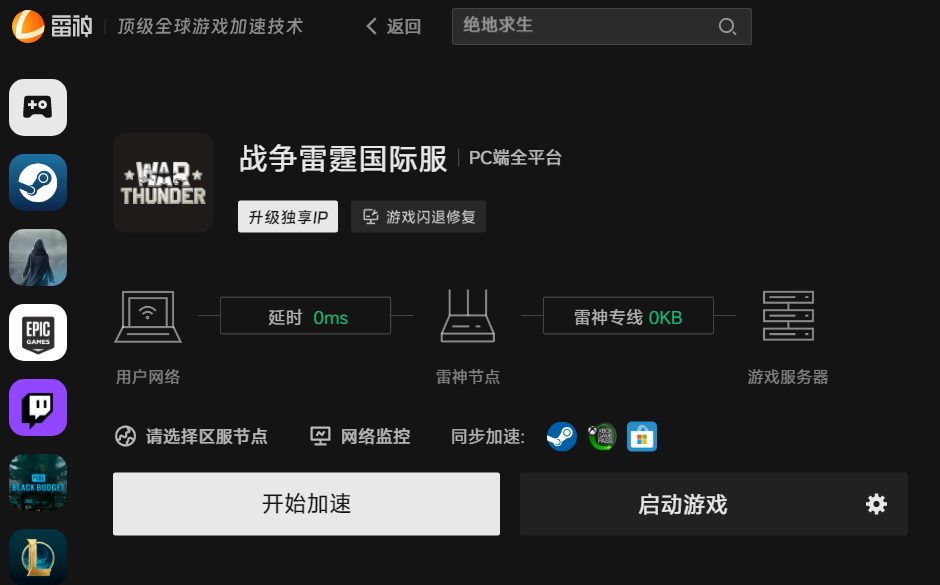 玩家在开启战争雷霆gaijin账号与steam平台的绑定操作之前,可以打开雷神加速器,搜索战争雷霆开启加速,改善优化网络,避免战争雷霆gaijin账号与steam平台的绑定操作失败。