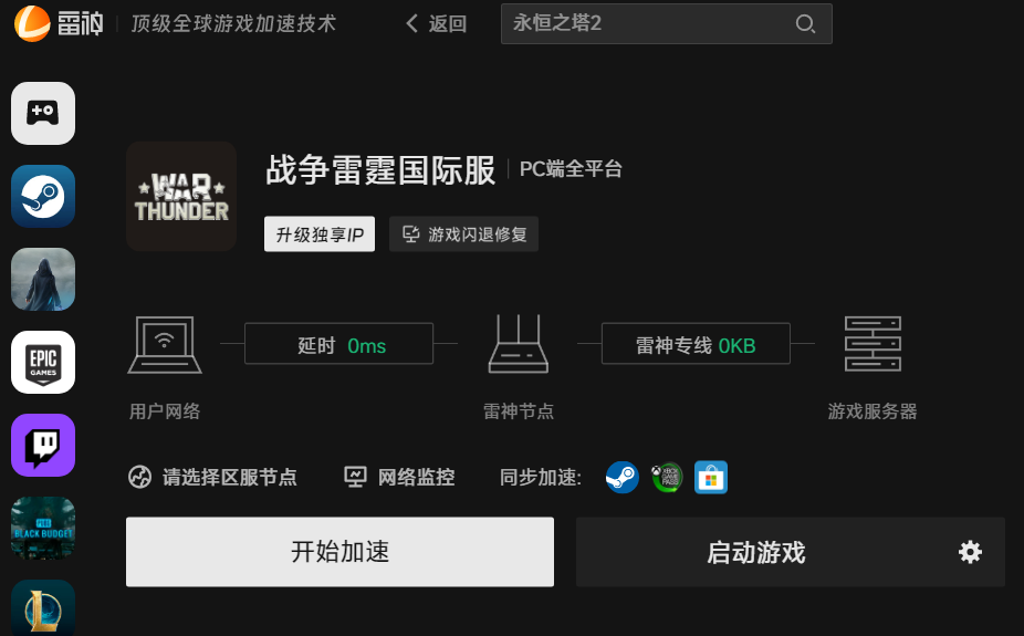 回到首页,顶部搜索栏输入“战争雷霆”,选择你需要游玩的区服和版本,点击“加速”开启网络优化。