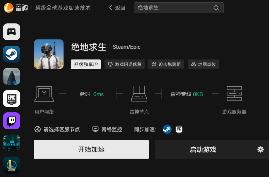 回到首页,顶部搜索“绝地求生”,选择你需要游玩的区服和版本,点击“加速”开启网络优化。