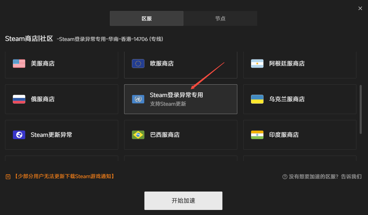 区服列表选择steam登录异常专线,一键免费优化,刷新steam官网/重启steam客户端,即可轻松流畅顺利通过steam验证。