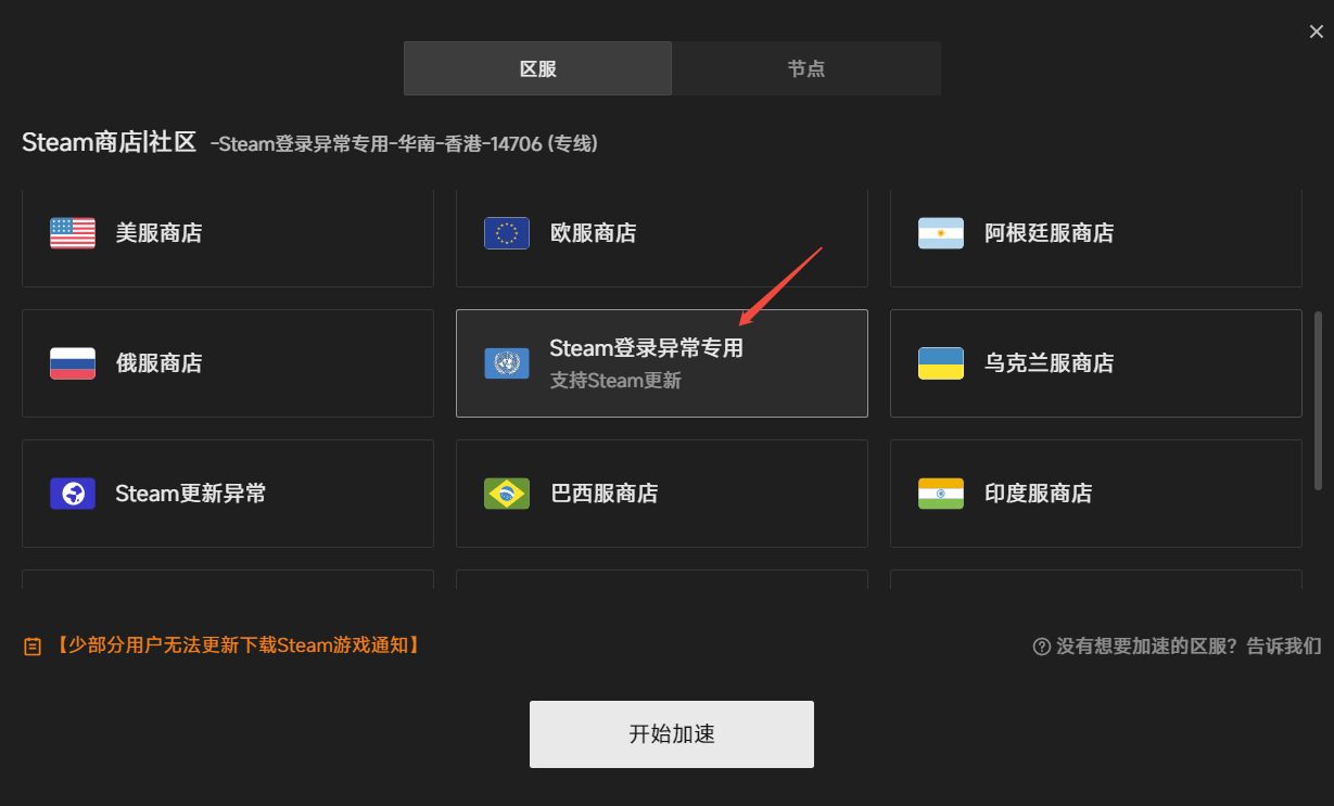 2、超全区服:Steam热门地区商店均提供专线支持,海量节点轻松畅联