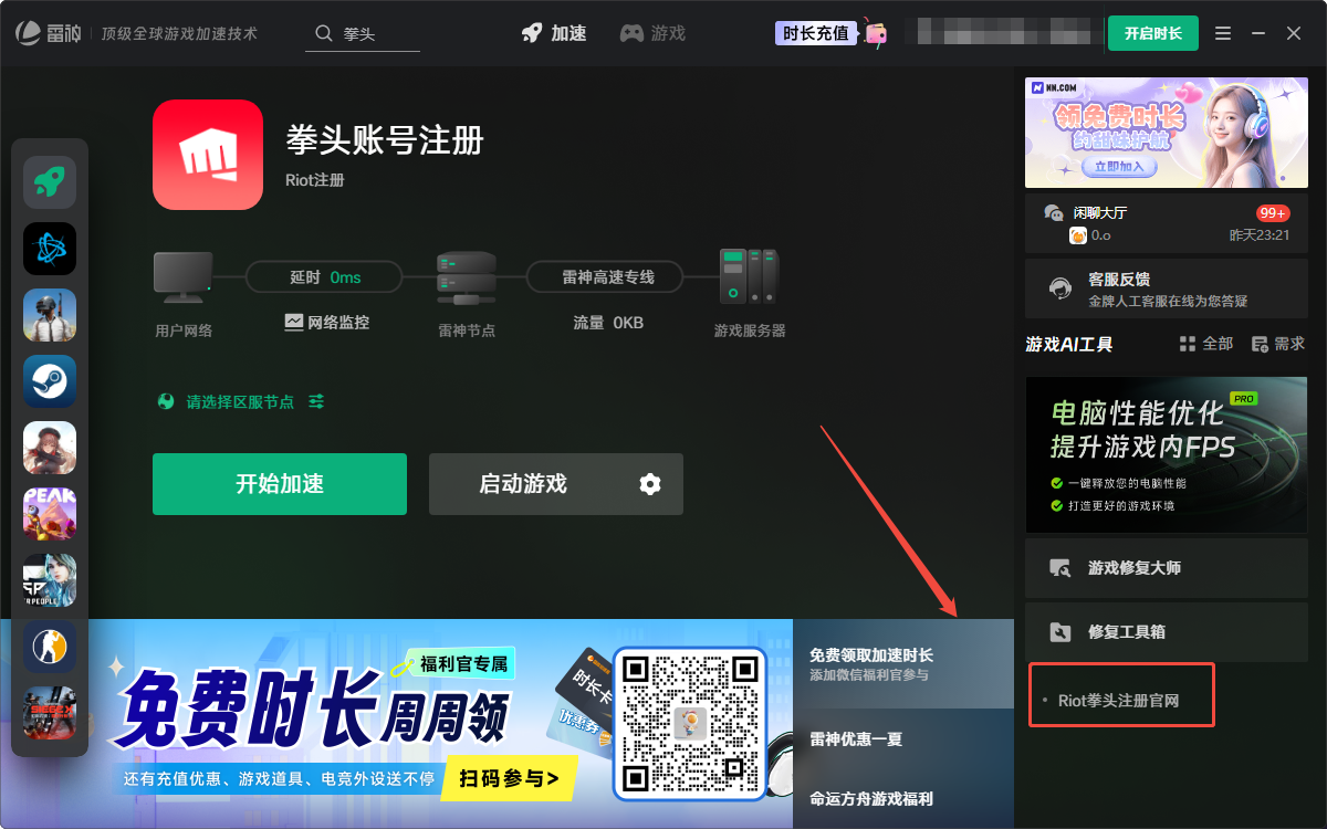 首先登录官网,这个官网是拳头官网,提供拳头旗下的所有游戏,包括瓦罗兰特和无畏契约、云顶之奕等等。拳头海外官网国内网络直接访问会出现页面打不开、加载缓慢、注册失败等情况,直接搜索网页容易出现盗版网站,因此需要借助雷神加速器进行网络加速,通过雷神加速器提供的快捷入口进入。