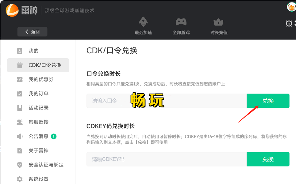 3、选择【口令兑换时长】,输入口令“畅玩”,点击兑换;